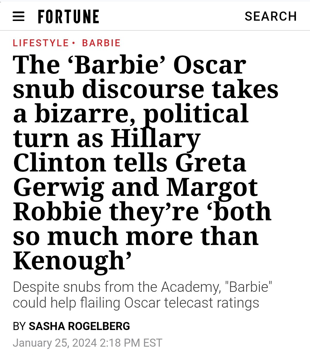 Oscar Snubs 2024 Presidential Campaign Editorial cartoons for Jan. 28, 2024: Presidential campaign : Despite Barbie receiving eight nominations for the 96th Academy Awards, Hollywood is still reeling from Margot Robbie and Greta Gerwig’s notable snubs in their respective acting and directing . Barbie” received eight Oscar nominations, including Best Picture, Best Adapted (er, yeah, that we have an issue with) Screenplay for Gerwig and Noah Baumbach, Best Supporting Actor for Ryan Gosling, .